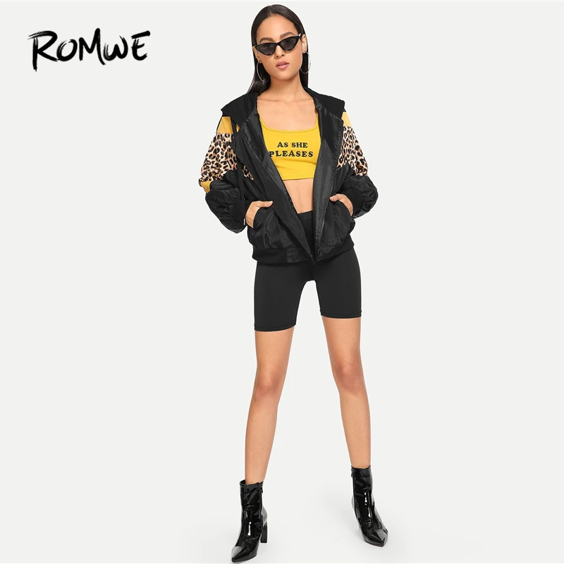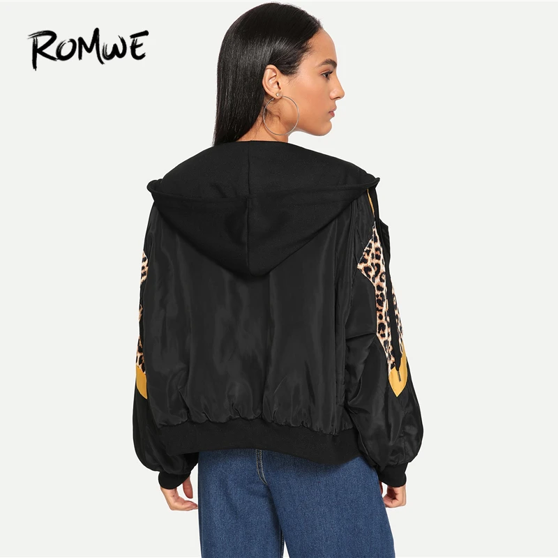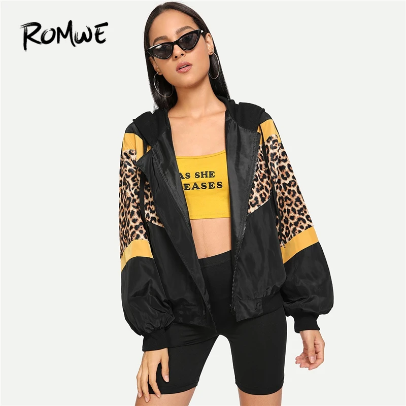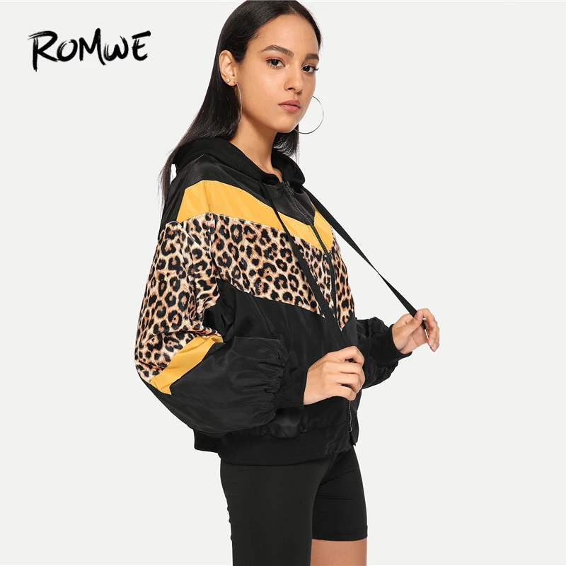 Super Sale ROMWE Leopard Print Hooded Jacket Women Autumn Clothing Sporty Womens Jackets And Coats Female Zip