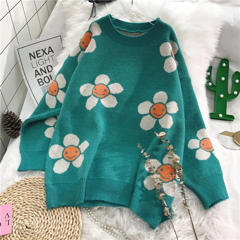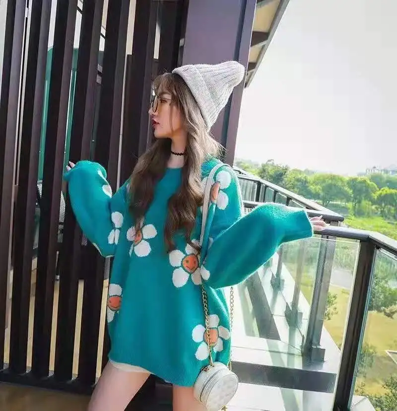 Best Seller Women 2019 Warm Autumn Winter Sweaters Loose Big Flowers Floral Jumper Casual Young Girls Party Out